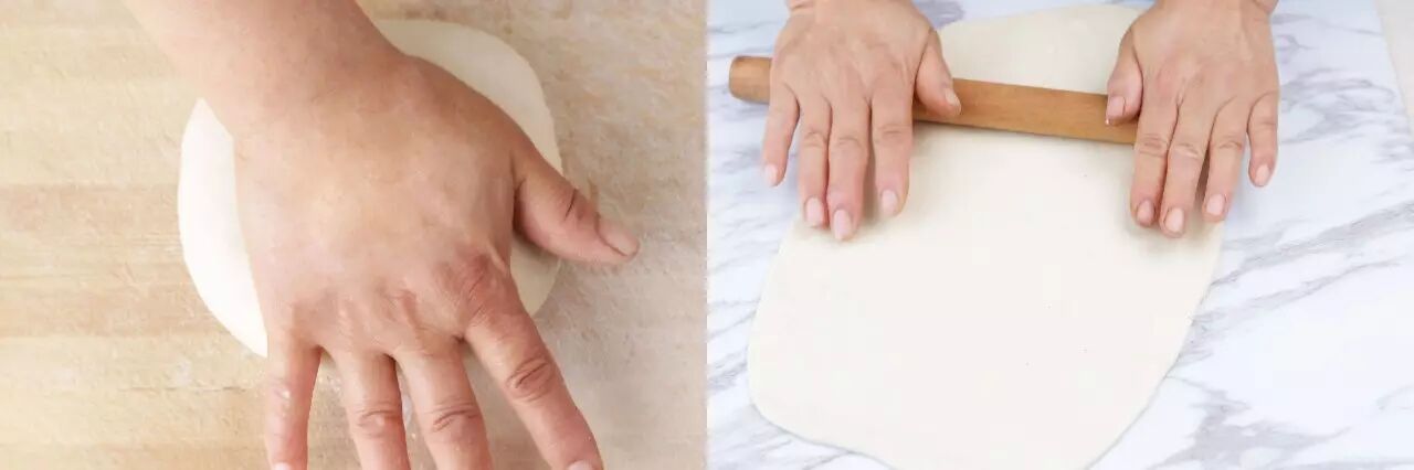 ⑨ 取出发酵好的面团,先将面团压成圆饼,用擀面杖擀成0.5cm厚的长方形。