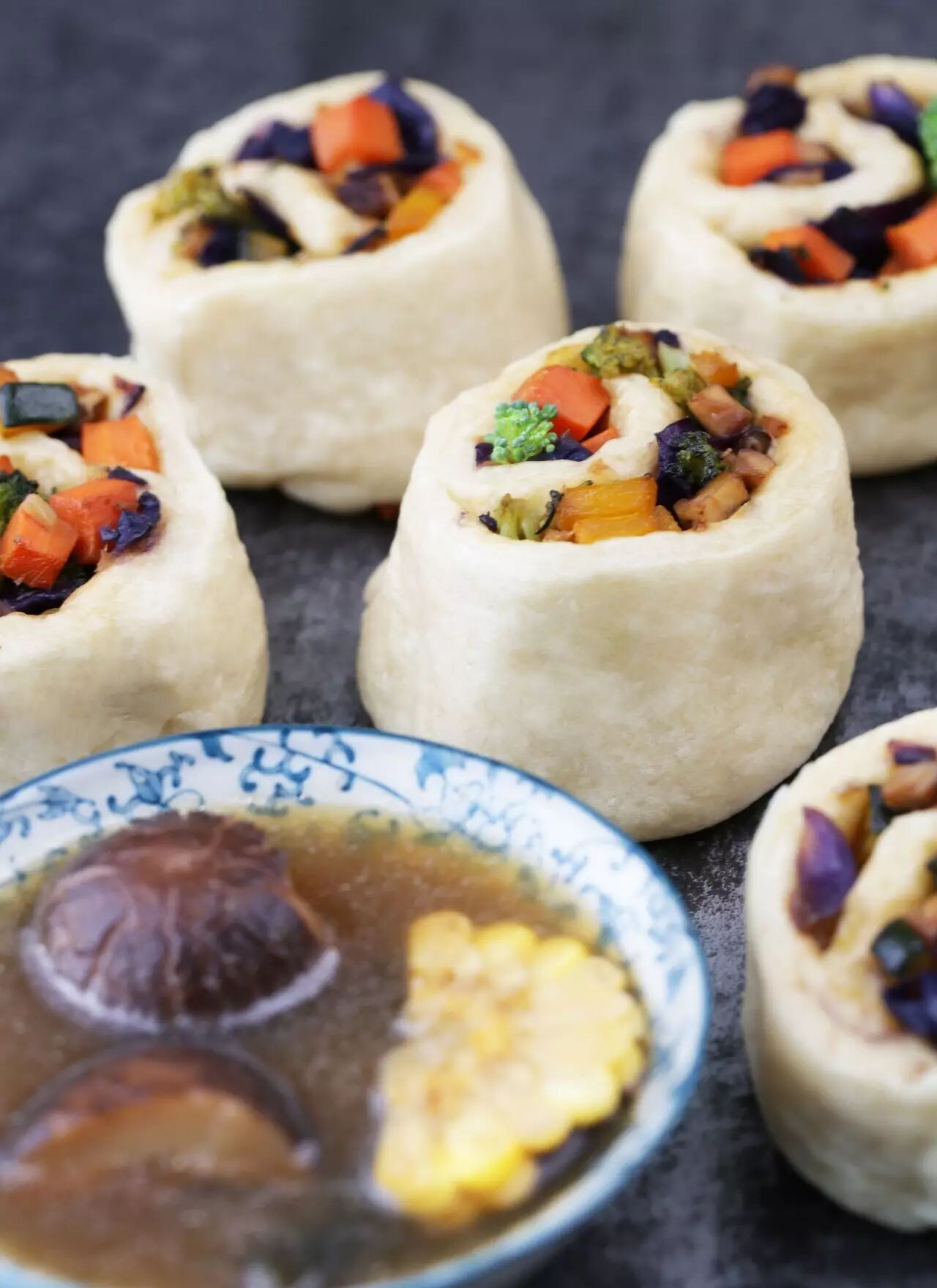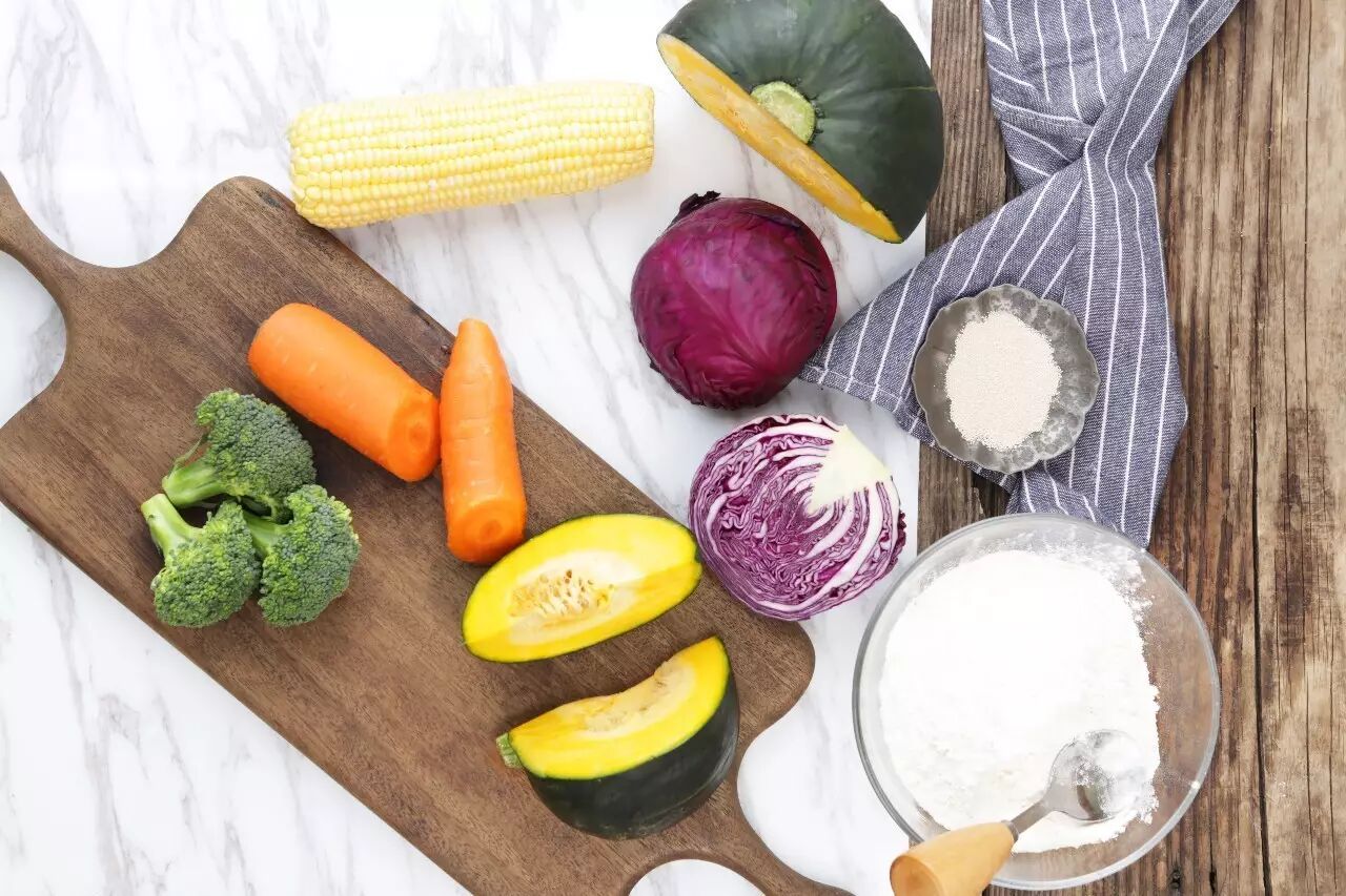 准备食材:高筋面粉、酵母、南瓜、胡萝卜、香菇、西蓝花、紫甘蓝、黑胡椒粉、糖、盐、橄榄油、腰果酱、松茸酱