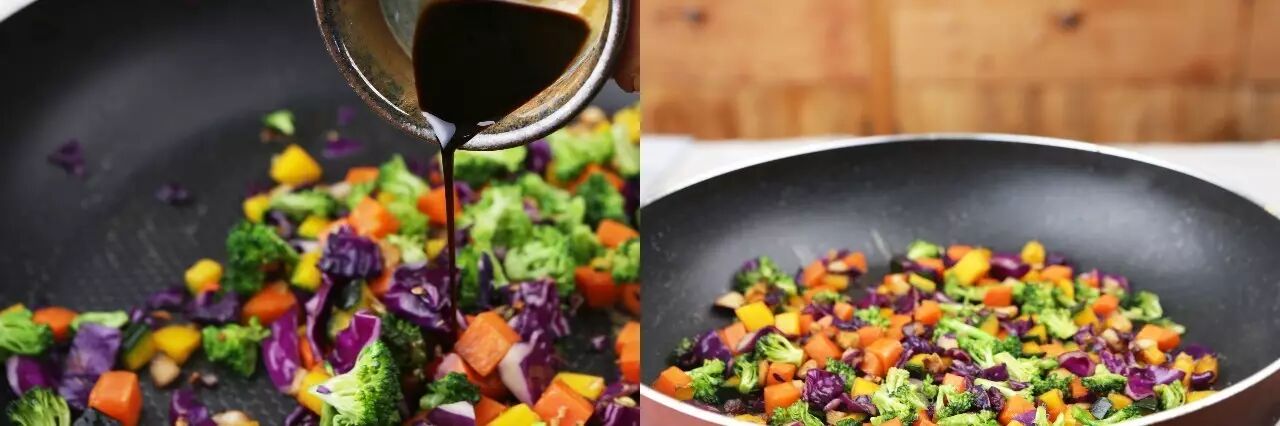 ⑦ 再加入胡萝卜、紫甘蓝、西蓝花继续翻炒至八分熟。