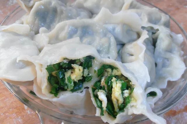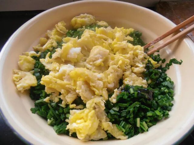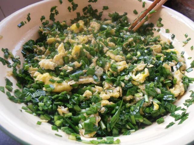 1. 面用温水和得软硬适中,盖上温湿的屉布醒20分钟,准备馅料。鸡蛋炒碎放凉,放在洗净切好的韭菜上面。