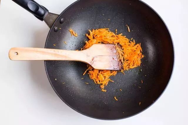 8.胡萝卜擦丝,用10克油炒软去除生涩味。