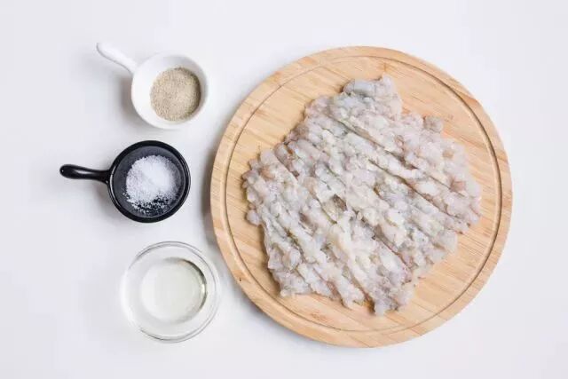 5. 虾肉用刀背剁成泥,加入5克油、2克盐、1克白胡椒粉调味。