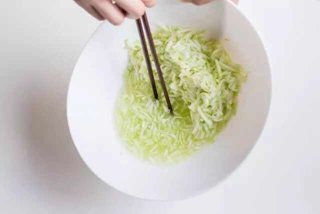 4. 将西葫芦丝捞出,用纱布包裹挤掉多余水分。