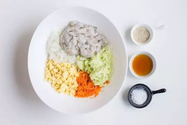 9. 混合处理好的所有食材(西葫芦、虾肉、粉丝、鸡蛋、胡萝卜),加入5克盐、2克白胡椒粉、10克香油,搅拌均匀。