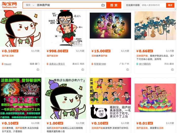小百在淘宝输入“活体葫芦娃”,竟然显示出9页在卖,每页有44个卖家,粗略一算也有400多卖家正在出售“野生葫芦娃”“野生活体葫芦娃”等,价格从1分到几十几百,有的甚至标价上千上万元。