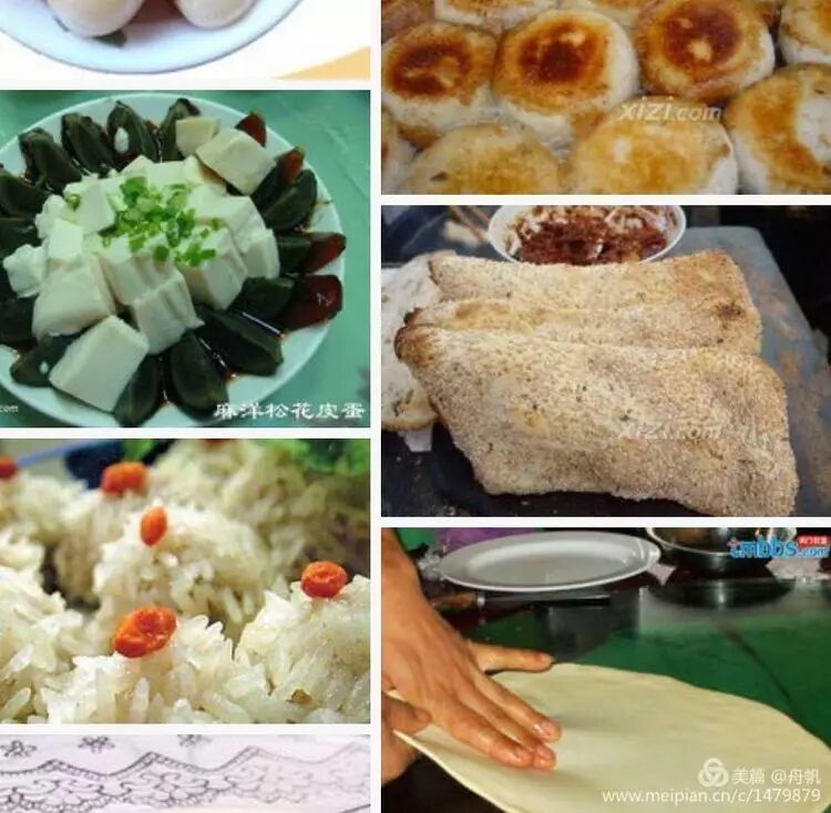 豆饼。用泡好的黄豆和少量绿豆混和磨成浆,再将大火烧热铁锅,以勺将浆舀入锅中,一勺浆摊一张皮。搭一张大竹席,将一张张的豆皮撒开摊凉,待冷却后撒入盐少许、切碎的蒜苗一把或者其他菜肴肉沫。一张张包成长方形。待吃时摆入平底锅内,用油煎成。虽然非常麻烦,但是好吃。