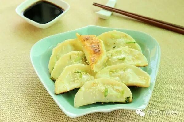 1.准备好饺子,将1汤匙面粉调成略稠的面粉水,注意不是浓稠的面粉浆2.取平底不沾锅,倒少许食用油,约1汤匙,温热,码入饺子3.将面粉水均匀倒入不沾锅中,并左右转动,使其均匀包在饺子上,面粉水约漫过饺子三分之一即可4.约6、7分钟后,可开盖看看,若饺子皮呈透明并鼓起状,表示熟透;若饺子熟透而水未干,就起大火收干水,同时撒入葱花,稍待片刻即可了![]()