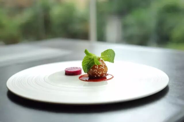 这个重点是在食材的选择上,买糖油果子时要挑炸的均匀的,长的好看的,也就是选特别圆的那种。先在盘子中间倒一小坨草莓果酱,然后选一个 好看的糖油果子放上去,在糖油果子上放片薄荷叶,旁边放块火龙果,这样简单摆放就可以了。