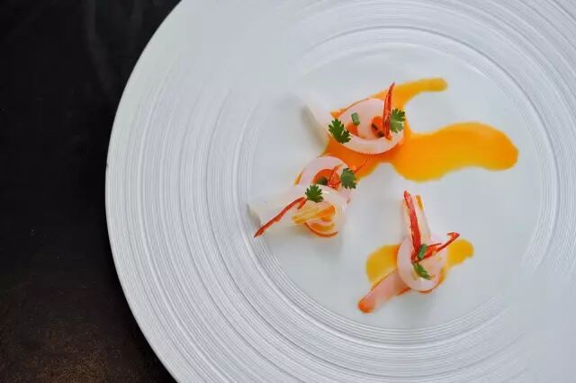 把北极虾的虾肉处理干净,经过特殊烹制形成条状,搭配芒果酱汁、巴西甜椒和卢森堡香菜。