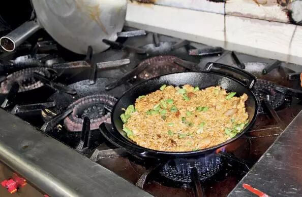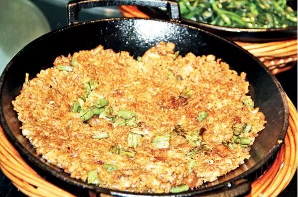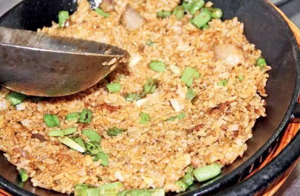 我说技术 看似简单的炒米饭却要经过三个关键工艺流程—先炒散米饭,再入煲仔炉中小火煎制,最后还要用小火焖制,最后做好的铁锅饭像一层压薄的锅巴,表面泛着一层金黄色的“煳嘎巴”。