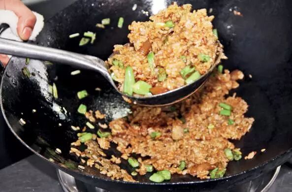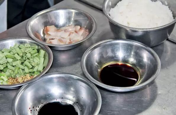 熟处理 将锅烧透,倒入色拉油25克炙好锅(注意锅底一定要烧红后再下油,否则容易粘锅),将咸肉丁放入锅中煸香出油,放入姜粒、葱节炒香,倒入四季豆炒熟后,倒入蒸好的米饭700克一起翻炒,淋入老抽4克、东古一品鲜酱油15克,加味精1.5克、鸡精2克调味,再翻炒均匀,炒香后倒入另一炙好的铁锅中。