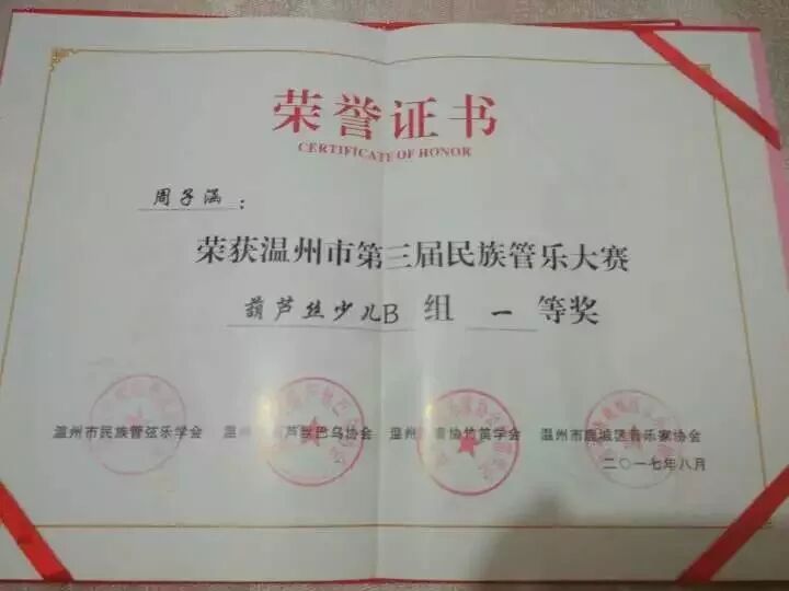 今年,是子涵的获奖“丰收年”:7月,他获得“丝韵浙江”首届葫芦丝巴乌全国邀请赛(独奏)少年B组金奖;8月,他获得温州市第三届民族管乐大赛葫芦丝少儿B组一等奖、云南省第五届葫芦丝、巴乌音乐节少年组一等奖……