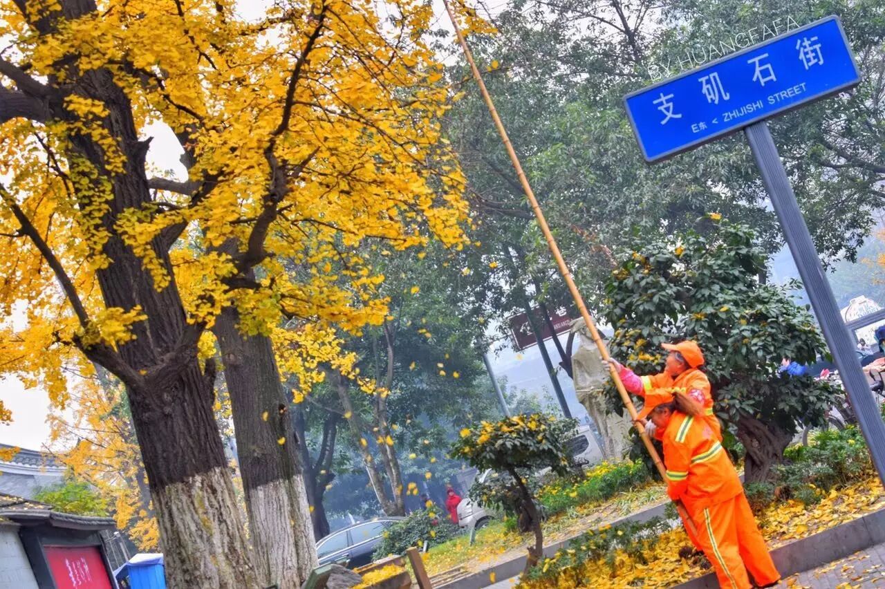 银杏好像是环卫叔叔嬢嬢的死敌,刚刚扫完,风一吹也一个劲的掉,所以扫之前他们都会拿着杆杆强行在树下浪漫一把。