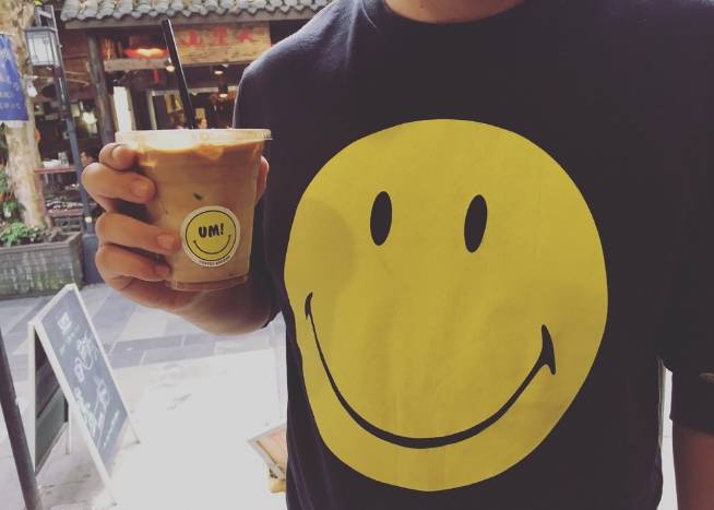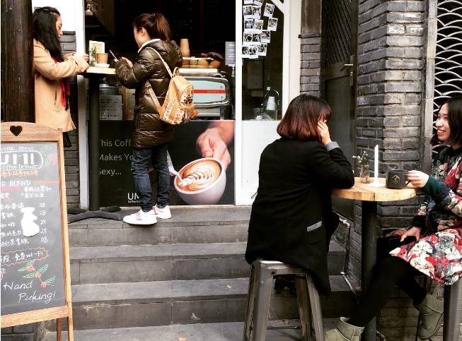 UM号称全成都最小的咖啡店,只有4个平方,门外有一张小小的圆桌,要想坐着喝,就只有坐在门口的台阶上~