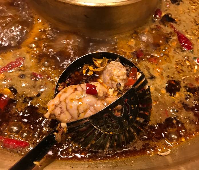 脑花,人家专门准备了弯把子漏勺来煮,这哈子也不怕煮的时候把她戳烂了。
