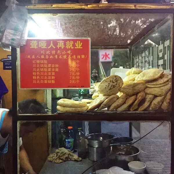 成都的锅盔铺不计其数,昔日的锅盔铺不叫卖,单凭手中的擀签子敲击案板,通过声响来招揽客人,如今的有些锅盔铺子不时也会叫卖。而这家『川北锅魁灌凉粉』,在这其中就显得略有特殊了,因为这是一家聋哑人开的锅盔铺。