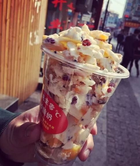 店里有两种酸奶,一种是原味的,一种是莫斯利安酸奶,里面放了很多红豆,葡萄干,花生碎,芝麻等等的,吃起来特别香特别爽,和冰淇淋相比,热量低很多,所以非常适合减肥的妹子!
