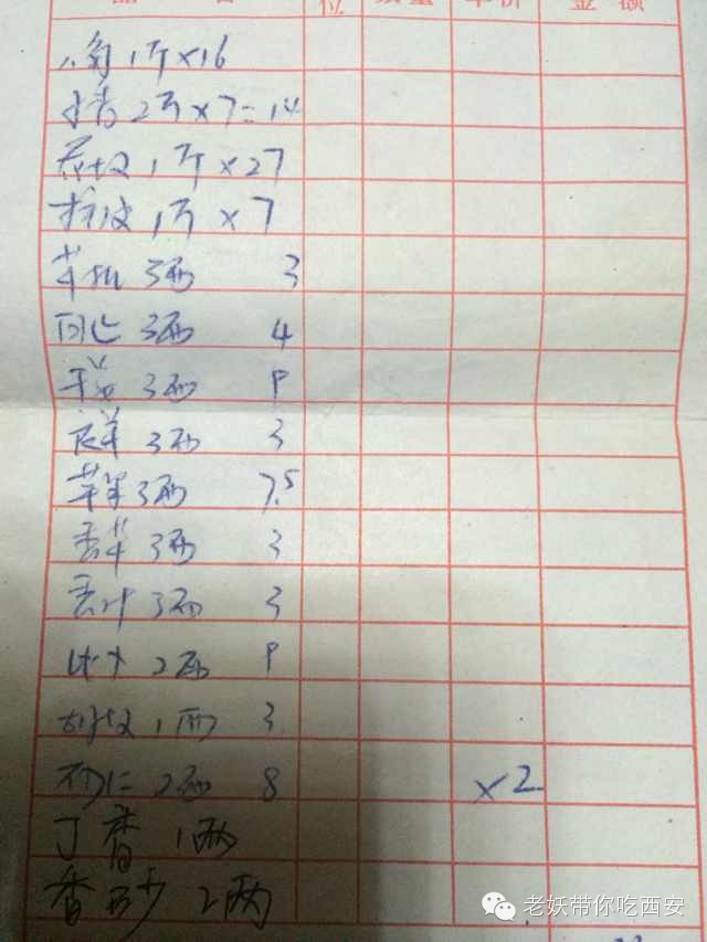 八角1斤,小香2斤,花椒1斤,桂皮1斤,草扣3两,白芷3两,干姜3两,良姜3两,草果3两,香叶3两,香草3两,毕卜3两,胡椒1两,砂仁2两,丁香1两,香砂2两