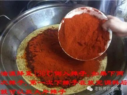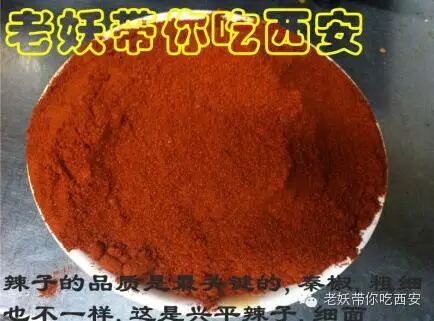 辣子的品质是最关键的,秦椒,粗细也不一样,这是兴平辣子(西府地区的辣椒都没问题,根据辣椒下来的季节使用,新辣椒更好,新疆产的线辣椒也不错),磨细面,未焙过火的,适合于米皮调制,以下过程也以米皮为例,工艺同样适合于擀面皮和凉皮。擀面皮用的辣椒较粗些,辣椒也是用油焙火碾制的,宝鸡人认为此种辣椒更香,但颜色上没有未焙过火的辣椒红亮。
