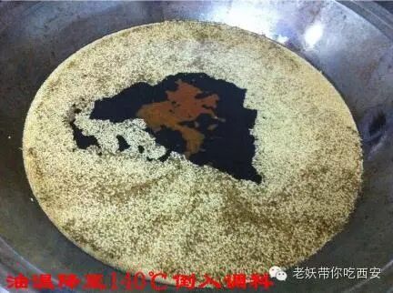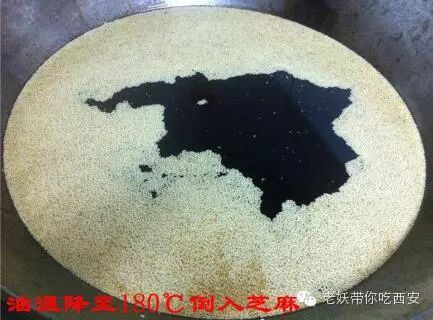 油温降至170-180度倒入芝麻,油温是关键,咋测?有经验的手一搭就知道,哥不会告诉你油温表在淘宝上几十块钱一个这事的。