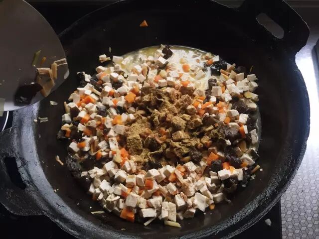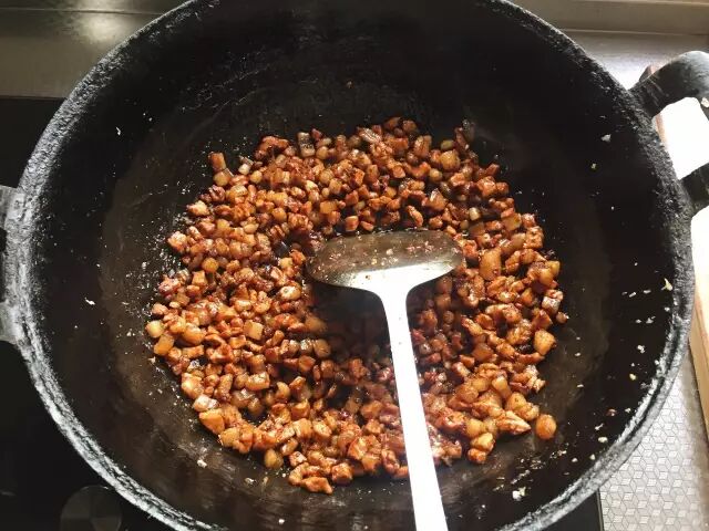 1、这时候肉臊子差不多好了,出锅时记得放一勺盐