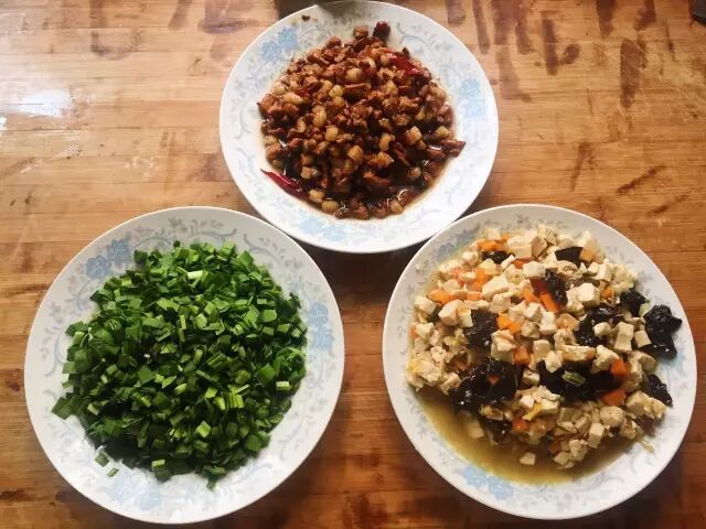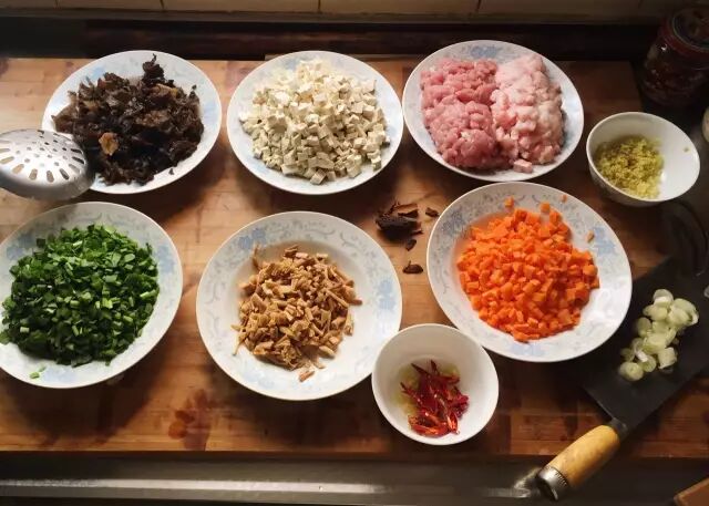 豆腐、木耳、黄花、胡萝卜、韭菜 (按照人口的数量准备肉和菜的比例大概是1:1.5)