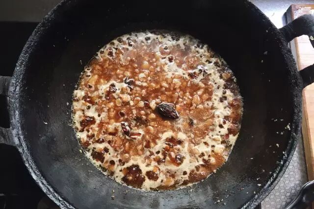 1、倒稍微多一些油,等油锅热后,倒入生姜末、辣椒和葱煸出香味