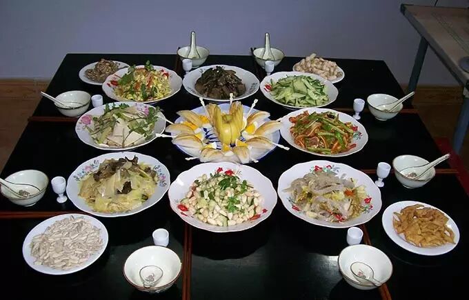 说完了特色小吃,正餐该上桌了。五颜六色流水席,七碟八碗十三花。商洛的十三花久负盛名,尤其在柞水、镇安、商南三地,十三花是招待贵客的礼遇。四荤四素四干果,中间摆上主菜,荤素搭配根据时令蔬菜,四干果也是跟随季节变换进行调配。眼下这个季节,板栗炖土鸡、商芝肉、南瓜豆角绿豆汤常出现在十三花里。如果同行的人在8人以上,就适合跟老板说,上一桌十三花吧。