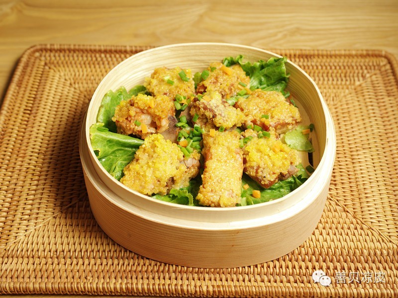 金沙糯米排骨 主要原料是来自颇具陕西农耕特色谷物黄米,即黍。《诗经》里有文“彼黍离离,彼稷之苗。”黄米是禾本科黍属的一类种子形小的饲料作物和谷物。一年生草本植物,植株叫黍子,生长期短,耐寒耐旱耐贫瘠;籽实叫黍,淡黄色;磨米去皮后称黍米,俗称黄米,为黄色小圆颗粒,直径大于粟米(即北方俗称的小米);黍米再磨成面,俗称黄米面。有粳性与糯性之分。粳性黍为非糯质,不黏,一般供食用。糯性黍为糯质,性黏,磨米去皮后称作大黄米或软黄米,用途广泛,可磨面作糕点,古代也广泛用于酿酒。