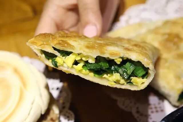 外表看上去像巨型煎饺,但其实做法很简单,把韭菜、鸡蛋捣碎和馅包在面里,烤到表皮金黄就可以吃啦~