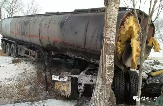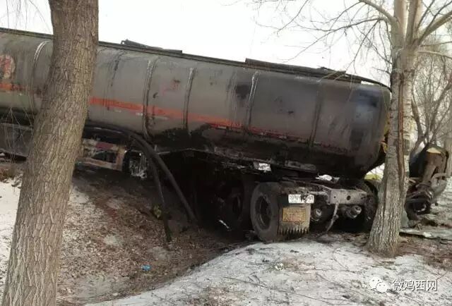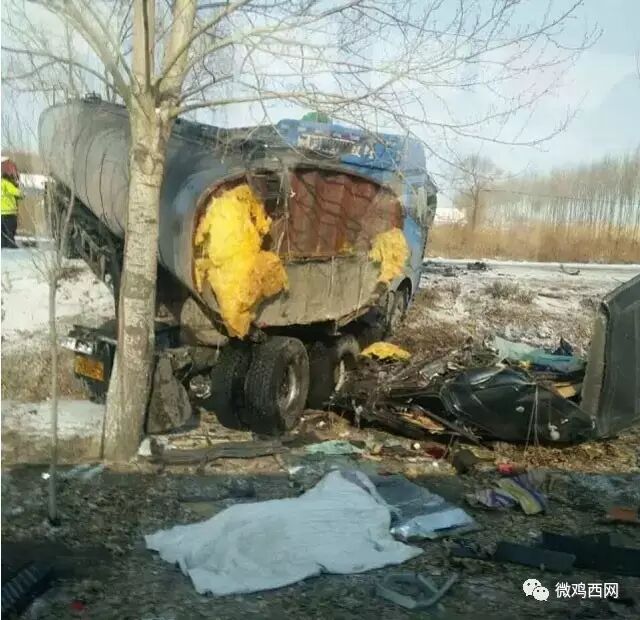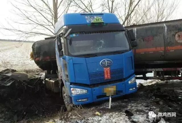 2月20日早上鸡西s309公路锅盔山庄入口处一辆大挂车与一辆油罐车相撞。大挂车的车头撞掉,致一人死亡!