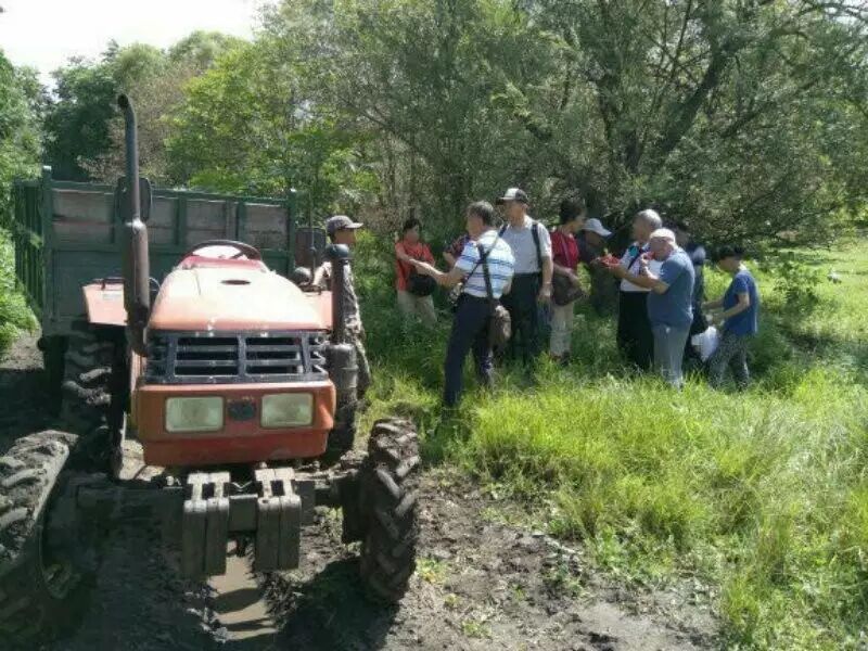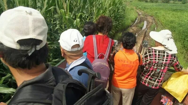 崎岖颠簸的田间路,坑坑洼洼的深沟、水坑,怒吼的拖拉机,摇摇晃晃的拖车,这一切让我们这些老知青也有点不适应,更别提从没下过乡的家属们,哪里经过这个阵势,唯独小朋友狂叫“好玩”,“好玩”!这一小时摇煤球式的煎熬,终于把大家带到了一片茂密的小树林前。下面的路就靠我们的双腿了。