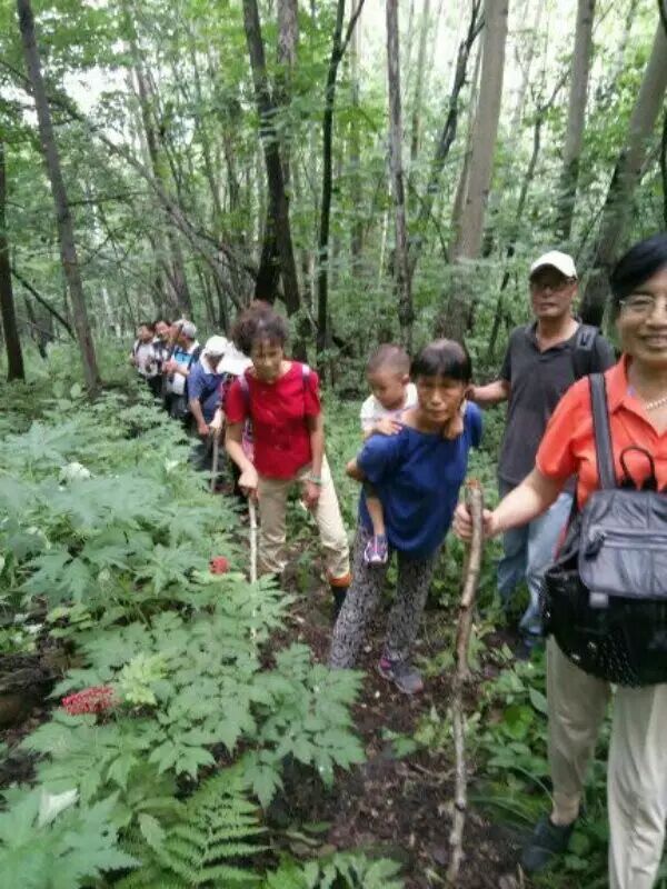 通过了沼泽地,后面的山路就好走多了。路很窄,就是树林里人们踩出的小路,一边往上走,一边还要迈过无数的障碍物。小朋友面对如此不好走的路,有点胆怯了,一直赖在奶奶的身上不肯下来,谁接也不行。这下可苦了李建一的夫人,抱着他一路不得休息。其实其他人也好不到哪去,夏大润前几天膝盖刚扭了筋,走路一瘸一拐的;李建一走平路还拄着拐棍呢;王建国糖尿病加高血压,他夫人腰椎做过大手术;张永和高度近视。唯有三个女生王秋霞、尹凤琴、王俊兰看上去精神抖擞,一直走在队伍的前面。
