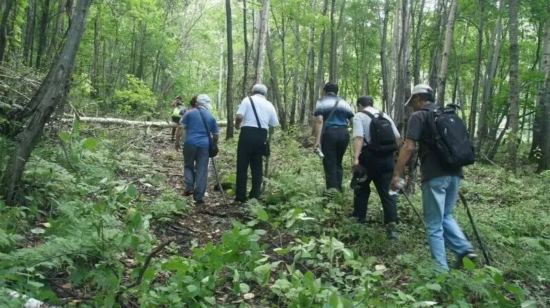 刚进到树林里百十米的距离,一片沼泽拦住了去路。东北地区沼泽地很多,年轻时踩着塔头墩子就过去了,可如今的我们.......,这笑话就闹大了。先是胖胖的李建一一脚踩到了水里,网眼的运动鞋灌满了水;接着武志华被绊倒,摔倒在塔头墩子上,除了鞋湿了,身上居然没有多少水,原来他也是肚子大,趴在塔头墩子上没掉下去;王建国一脚没踩住,从塔头墩子上掉了下来,噔噔噔跑了好几步才站住,像个“英雄”一样去扶夫人。那些没有下过乡的家属们小心翼翼的顺利通过,倒是让他们的丈夫惭愧不已。