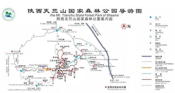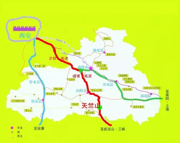 从西安自驾车前往天竺山,可沿沪陕高速公路前行至商洛方向,然后走福银高速至山阳方向。全程高速,道路状况良好,车速可达100公里/小时,只需1.5小时即可到达山阳天竺山。