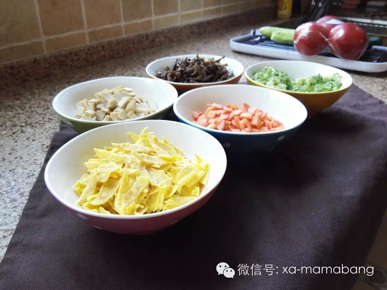 黑色木耳,红色萝卜,黄色鸡蛋,绿色葱花,白色豆干分别盛于五色碗内,引诱着味蕾!