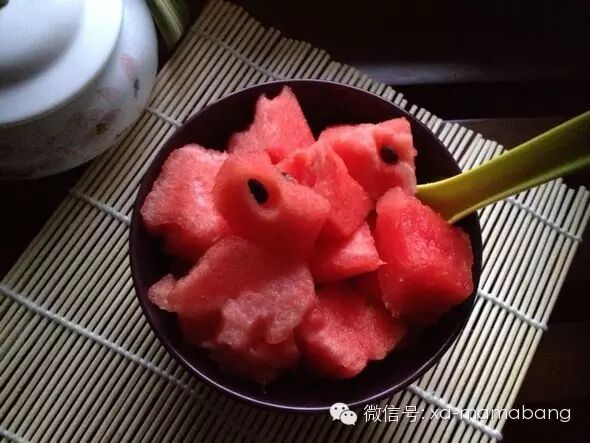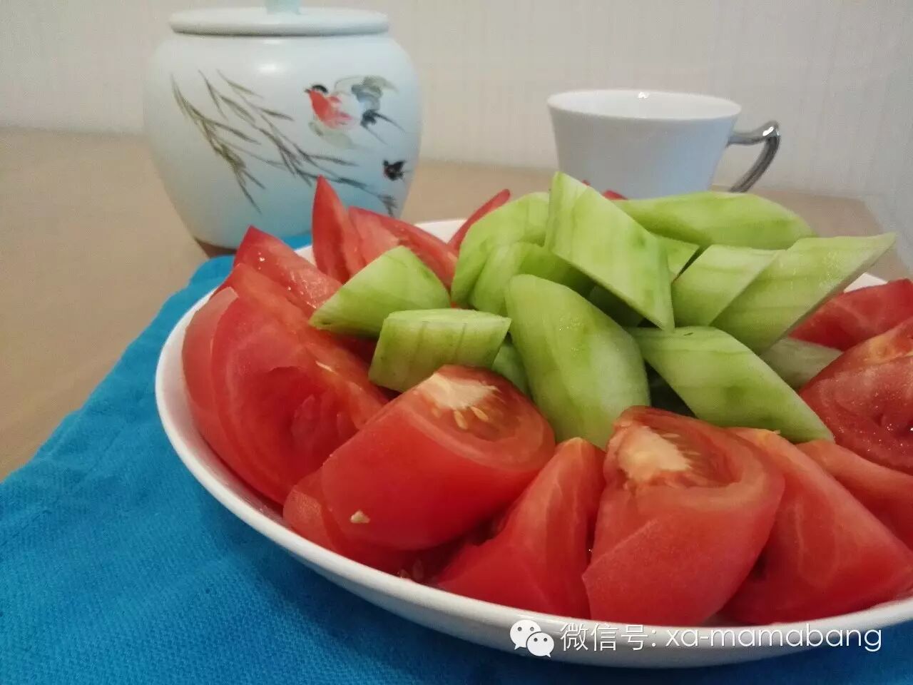 沙沙的西红柿,翠翠的黄瓜,还有甜甜的大西瓜,切好,摆盘,大家随意拿取。