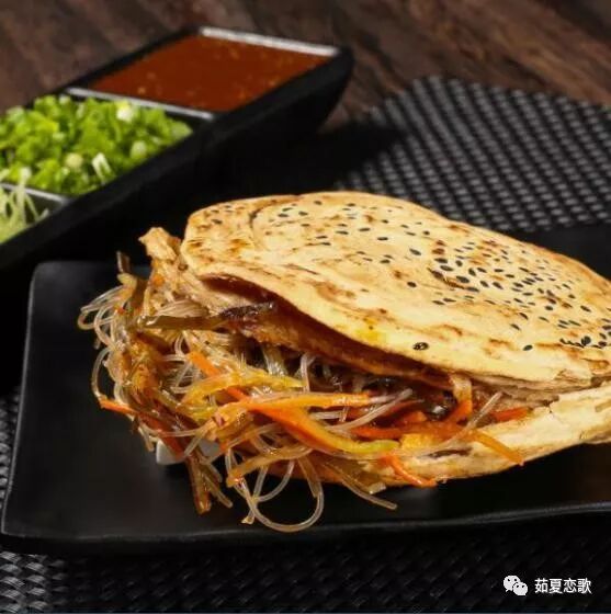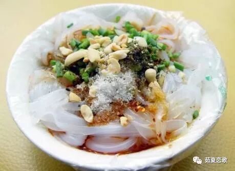 5、用一个小铁刮子,将倒扣在案板上的一个洗脸盆一般形状的凉粉细细地刮上一碗,放进红油、盐、酱、醋,抖上一点花椒粉、胡椒粉,浇上生姜、蒜水,撒上几丝青葱的芫荽,在金黄黝黑的土碗里拌得晶莹剔透,鲜红耀眼,然后就从锅盔切出的口子处灌进去,装满锅盔的肚子,那金黄酥脆的锅盔灌便成型了。