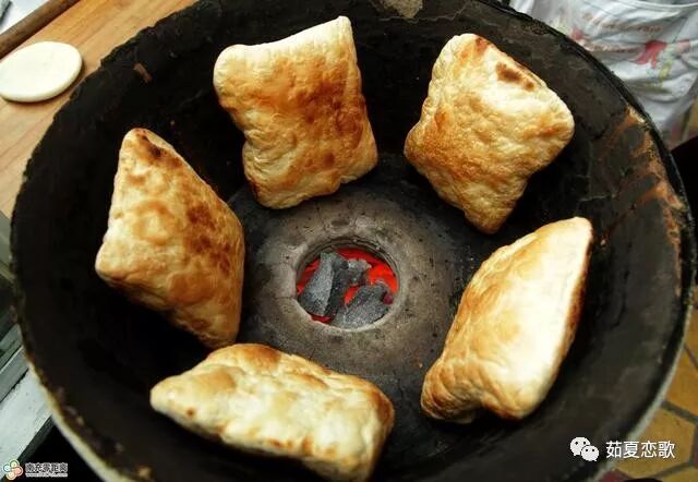 4、面饼变得金黄蓬松之时,起出灶膛,用一把雪亮的小刀沿锅盔边沿,切入,理开一道小口;