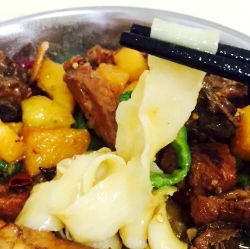 鸡烧得很入味,又很嫩,里面有丰富的肉汁。吃一会儿把皮带面拌进去,吃完鸡或者一边吃鸡一边吃面,都很好吃。面手工面很筋道,煮得也恰到好处。现在因为生意不如以往,鸡肉没有以前的鲜嫩,但还是佩服这对热情善良的老板夫妇的坚持。