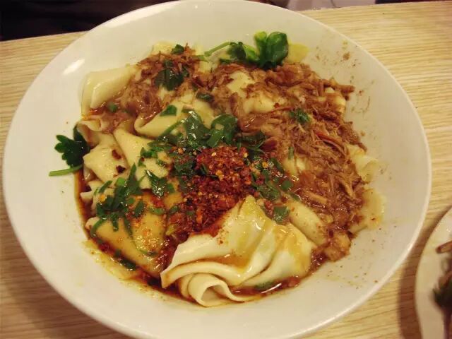 “biang——biang——”,即面与案板碰撞发出的声音。biangbiang面之名也由此而来。传说,古时有个穷困潦倒的秀才要进都城咸阳考试,饥肠辘辘之时他刚好看到前面有一家面馆,里面“biang——biang——”之声不绝于耳,秀才不由得踱步进去。只见白案上摆满了和好的长条状面块儿,师傅拎过一块儿,扯住两头,顷刻间摔打成裤带般宽厚扔进锅里,不一会儿就从锅里捞出一大海碗,碗底事先盛着作料和一些豆芽青菜,再浇上一大勺油泼辣子,刺啦一声,香气四溢。秀才叫了一碗,吃罢,秀才才想起自己身无分文。他与店小二商量:“小二,你家这面何名?”答曰:“biangbiang面。”秀才问:“biangbiang字咋写?”见店小二答不上来,秀才顿时有了主意,他说:“小二,你与老板商量过,本人今天没钱,可否写出‘biangbiang’二字,换这碗面吃?”店小二顷刻间回来,说:“对。”