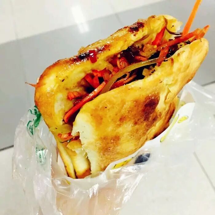 锅盔本身是现烤的,很酥脆,不油腻。里面夹的凉粉也是现拌的,味道可以自己选择。