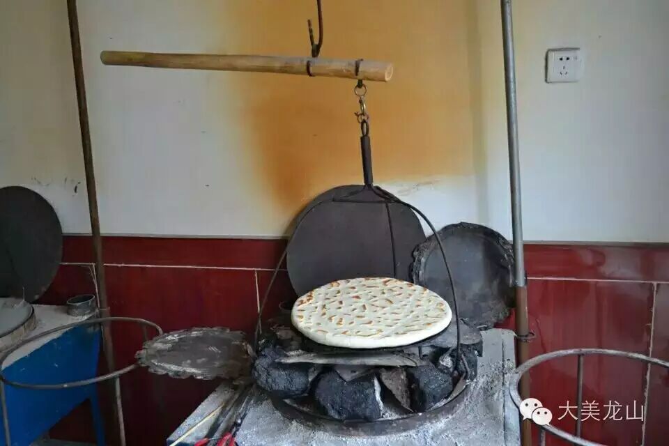 第五步,在炭火平底锅里反复烤熟。这锅盔就做好了。