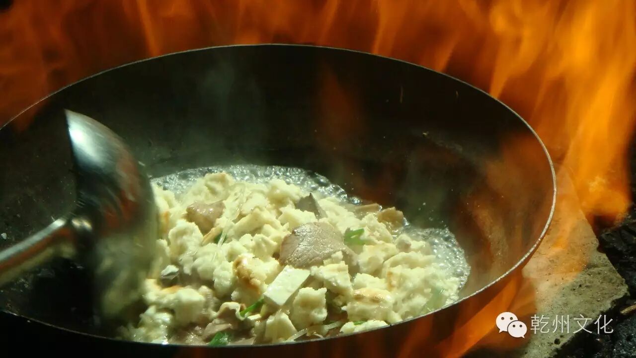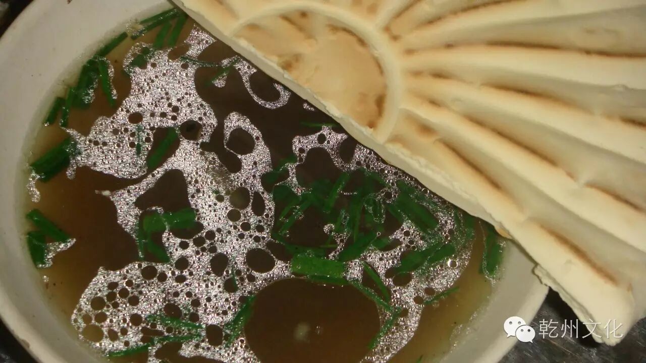 其一,冒馍:1、在原汁羊肉汤中兑入适量水,并加入虾酱、胡椒粉以调和其味。2、将乾州锅盔用手掰成小块于碗中。3、在碗里切上羊肉、羊血及豆腐。4、在碗里撒上香菜、葱花并捏少许粉条,根据个人需要加入味精、鸡精,勾入泡制的调料水,最后浇上滚烫的肉汤,反复几次,直至肉热、馍透为止。