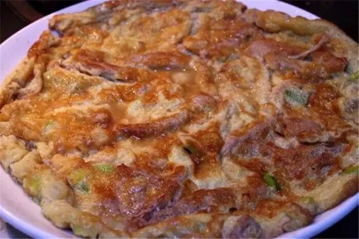 4、热锅煎调好的蛋液,上面的蛋液未凝固时放入肉片,一面煎黄翻面。