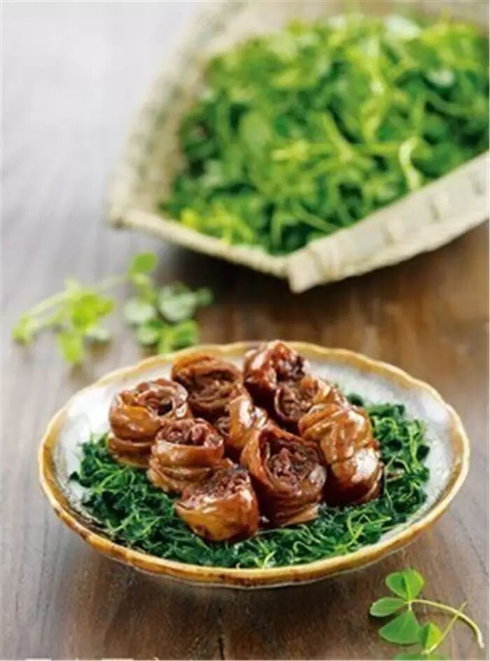 9、 另起锅将猪油烧沸,放入草头煸炒,加酱油、白糖,至断生装盘,将做好的圈子放在上面即可。