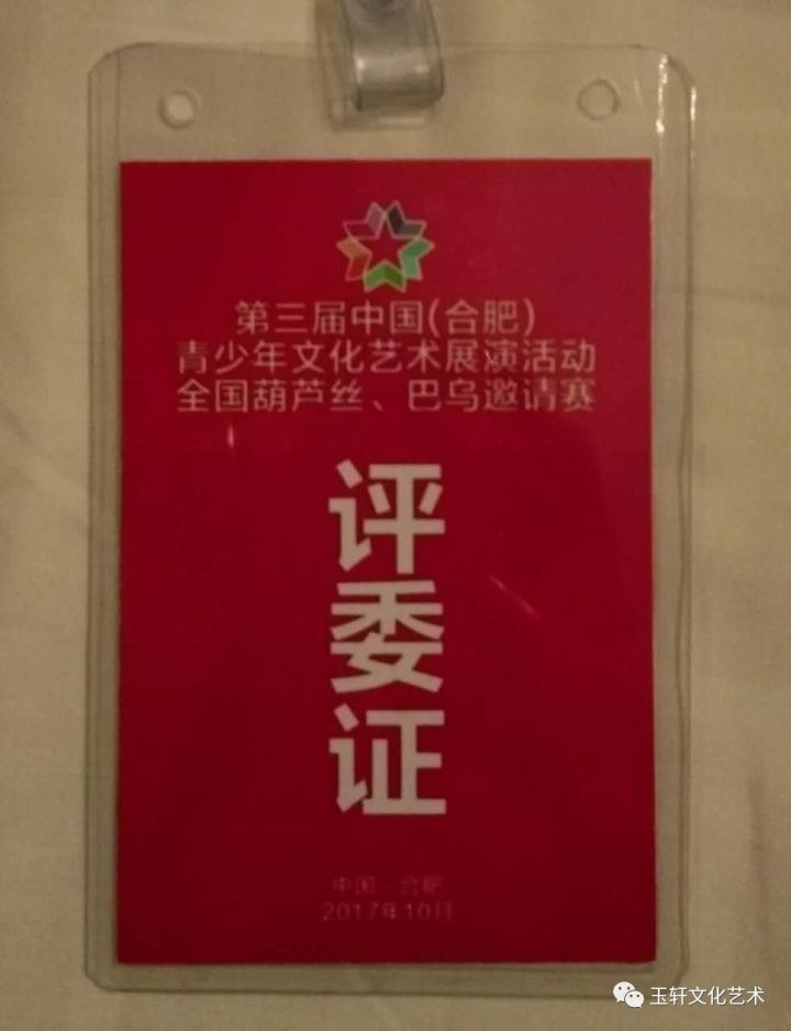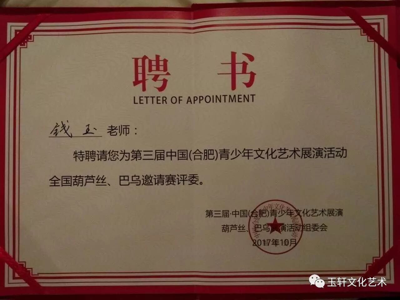 热烈祝贺桐城市玉轩教育集团葫芦丝培训学校校长钱玉轩被聘为第三届中国(合肥)青少年艺术展演活动葫芦丝巴乌邀请赛评委!