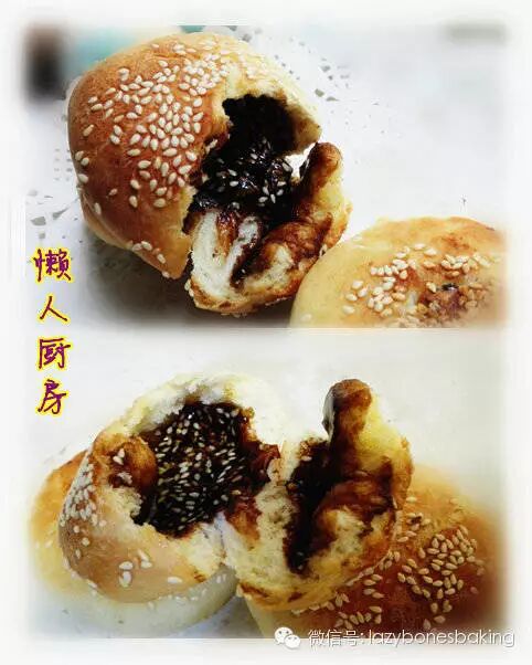 面皮:普通面粉100克、高筋粉100克、即发干酵母2.5克、牛奶50克、水55克、白砂糖20克、盐2克、橄榄油4克、奶粉4克馅料:芝麻15克、红糖70克、低粉17克、黄油20克份量:8个1.所有面皮材料入面包机揉面30分钟,取出揉成团覆膜发酵50分钟左右,成2.5倍大;发酵结束,按压排气,总重335克左右均分为8份,每个面团重约42克,覆膜松弛15分钟。2.发酵期间准备馅料。将芝麻烤香与低粉、红糖均匀拌好,倒入融化的黄油成润湿状。3.面团松弛结束,轻擀成圆片,包入馅料,封紧收口,再次轻擀成薄圆片,收口方刷上清水沾上芝麻。4.烤箱180度预热,取六个锅盔先烤10分钟左右。5.取出翻面继续烤10分钟左右,虽然没有经过二发,但面饼还是明显地发胀了。6.余2个试用平底不粘锅煎制,均匀小火,初期锅里略加点油,正反两面都需要煎制,时间总共15~20分钟左右。7.两种不同方法的成品对比。8.用烤箱制作的特点是表皮硬脆,内部绵软,红糖流动性好过煎制,但不够润湿;9.煎制版手感绵软,口感软糯,更有嚼劲,红糖流动性不如烤制版。
