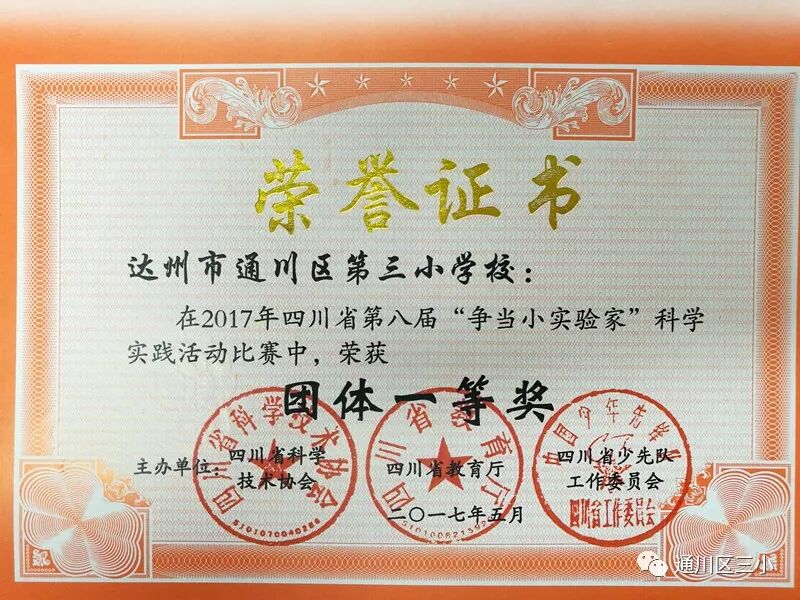 (三)、2017年5月获得四川省教育厅颁发的四川省第八届“争当小实验家”科学实践活动团体一等奖。