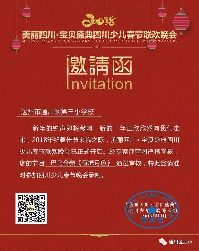 3、2017年11月25日学校选送的器乐表演《荷塘月色》被四川电视台2018少儿春晚选中,并于2018年1月1日参加正式录制。